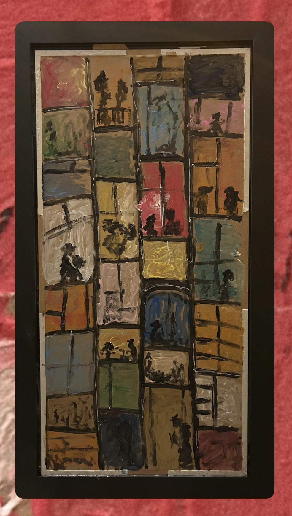 récupération d’unevielle planche de bois, quadrillé au crayon de bois pour délimiter les pièces, puis peinture acrylique, ajout des ombres noires pour les personnages dès que la peinture a séché, puis légères traces de blanc liquide pour donner un peu plus de lumière à la peinture, puis encadrage de la « toile »