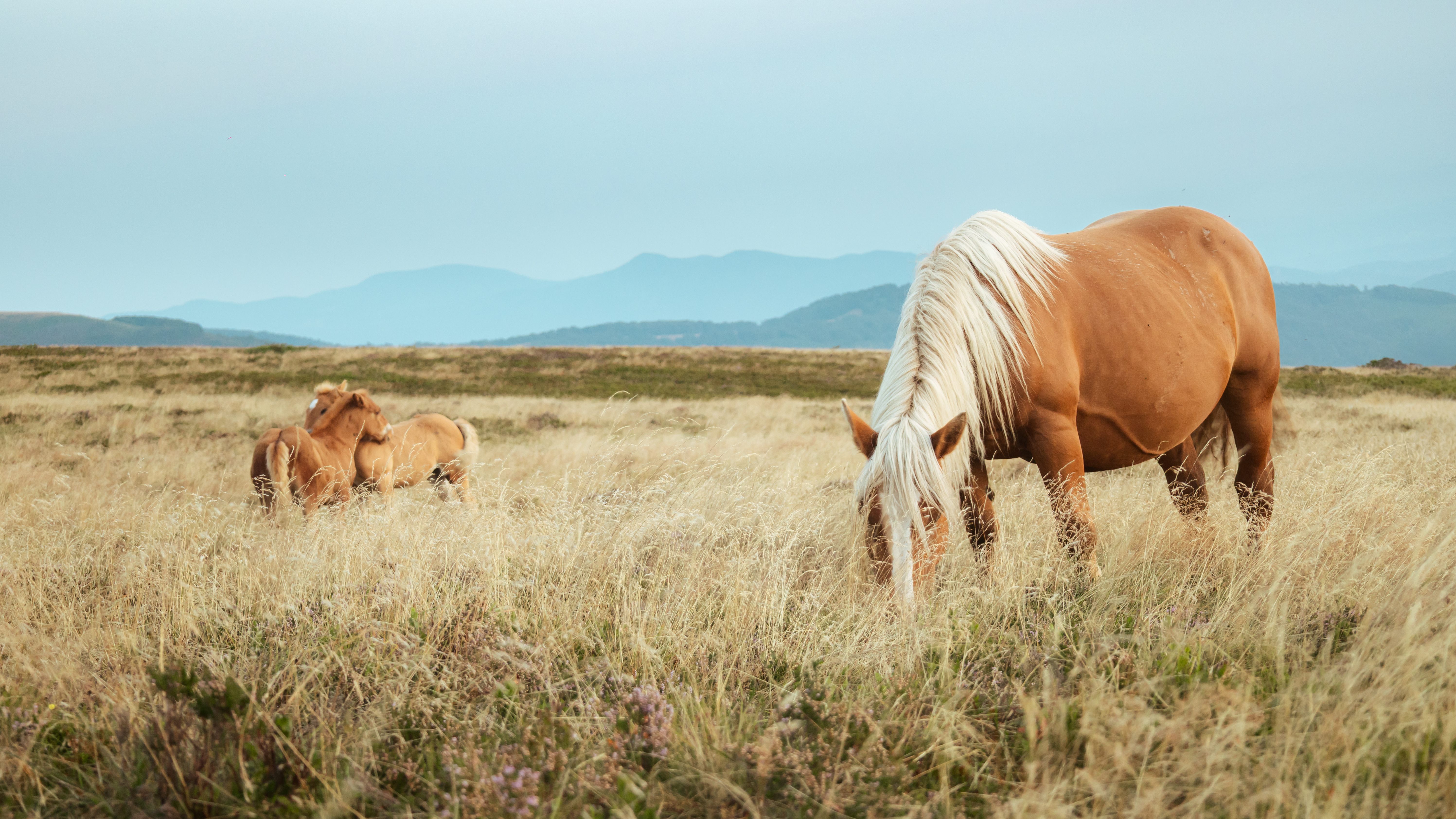 J'étais parti faire un bivouac en haut d'une montagne dans les Pyrénées pendant l'été. Levé très tôt pour voir le lever de soleil, je suis tombé nez à nez avec un troupeau de chevaux qui broutaient. Des poulains jouaient dans l'herbe. Certains curieux sont même venus me voir. J'ai alors cherché à capturer l'instant assez unique et paisible. J'ai alors repéré cette jument et deux poulains légèrement à l'écart. Je me suis doucement approché pour ne pas les déranger et j'ai capturé l'instant.