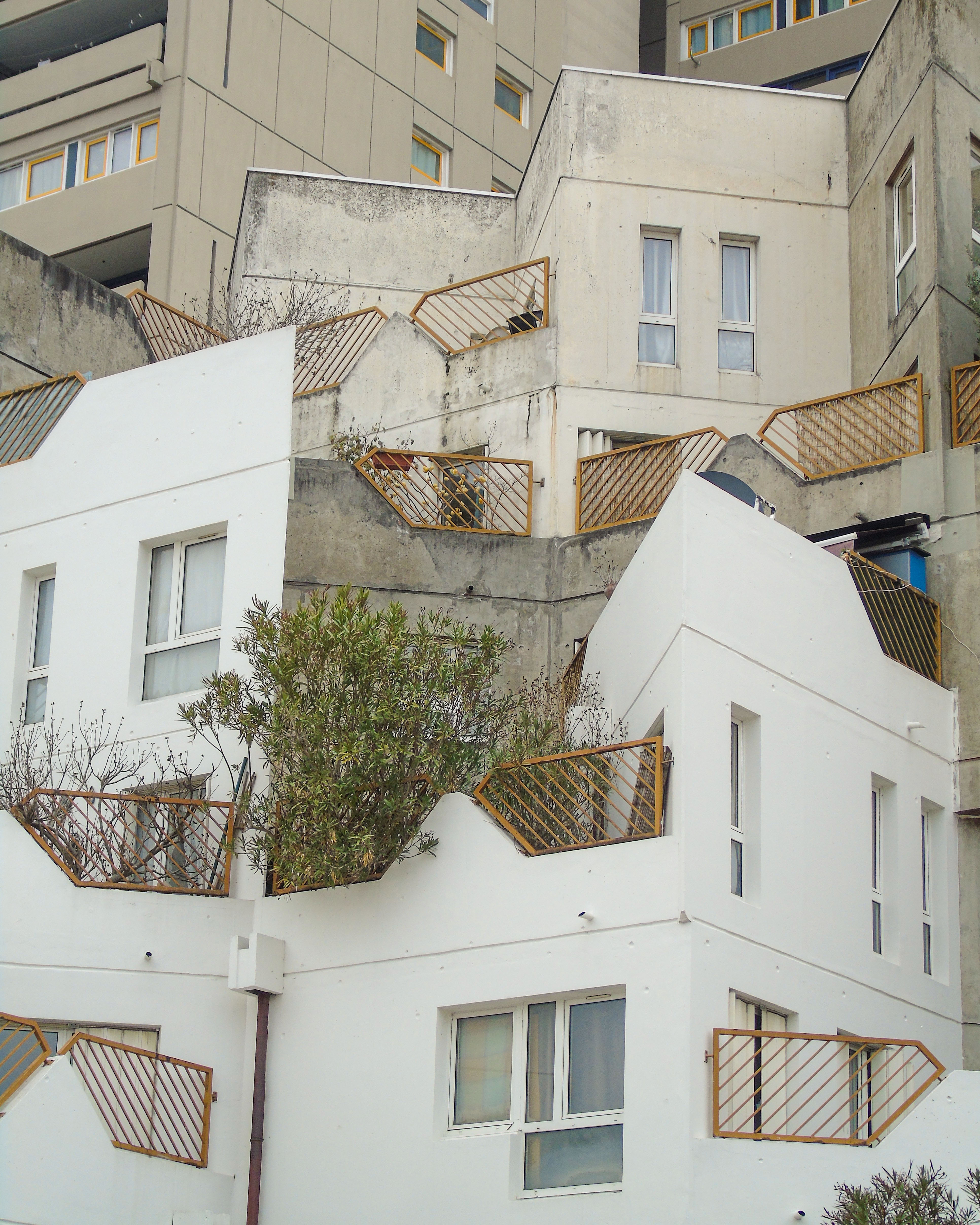 Pour aborder le territoire vivant, je me suis intéressée à des bâtiments que je côtoie au quotidien. Ils constituent un paysage familier en constante évolution où l’architecture en terrasses offre un terrain d’observation des relations entre le vivant et le non-vivant. Le choix d’une prise de vue resserrée sur une portion du bâti permet de révéler à la fois l’architecture et les signes d’habiter. Ce cadrage met en avant volontairement un espace fortement construit et minéral, afin de faire apparaître les formes d’appropriation qui l’animent. Il y a donc celles de l’espace, avec les aménagements des terrasses, et celles du vivant, perceptibles dans les jardinières et plantes en pots. Il s’agit aussi de rappeler que le vivant ne se limite pas à l’animal ou au végétal, mais inclut également les traces humaines, leurs aménagements et les conditions qu’ils créent pour permettre la vie.