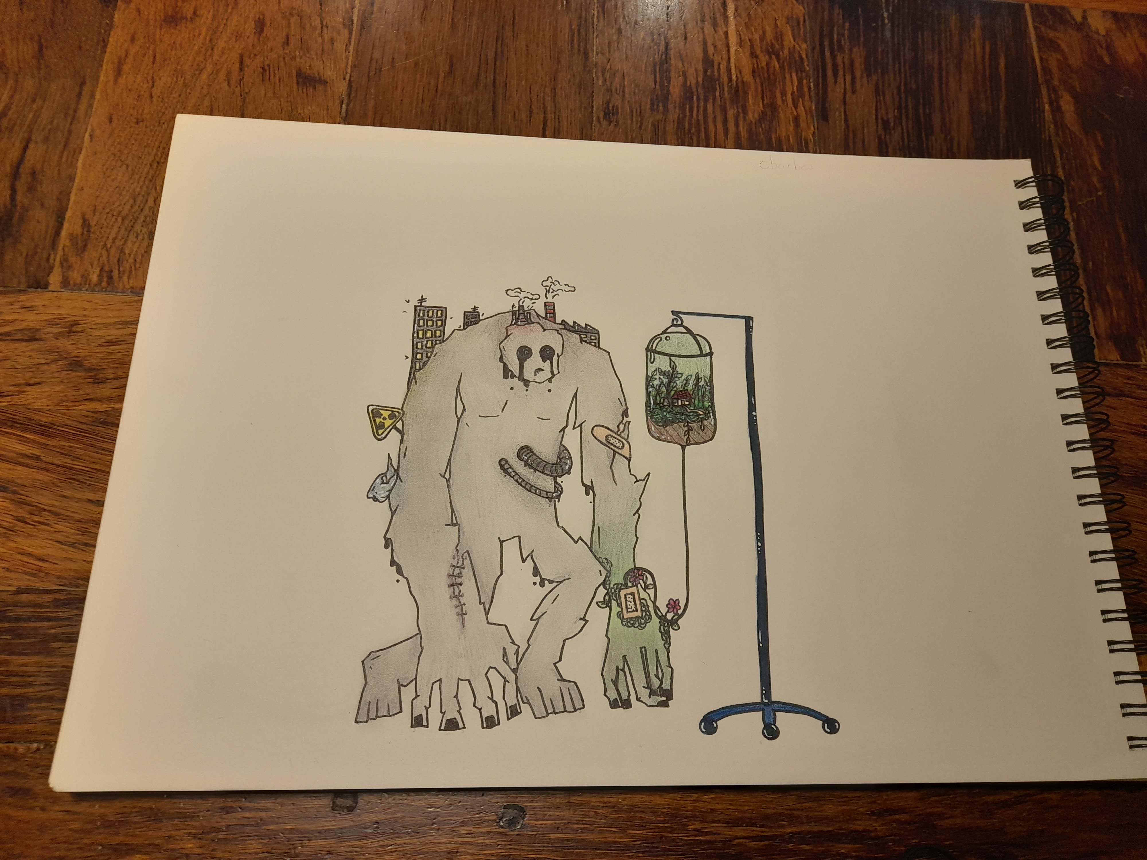 J'ai donc représenté ce territoire vivant avec un être vivant qui est donc exploité avec des usines sur son dos et un immeuble, ainsi que l'extraction de ses richesse et, netre autres, du pétrole, dans son ventre. J'ai aussi rajouté un sac plastique sur son bras gauche pour rappeler la pollution des océans.