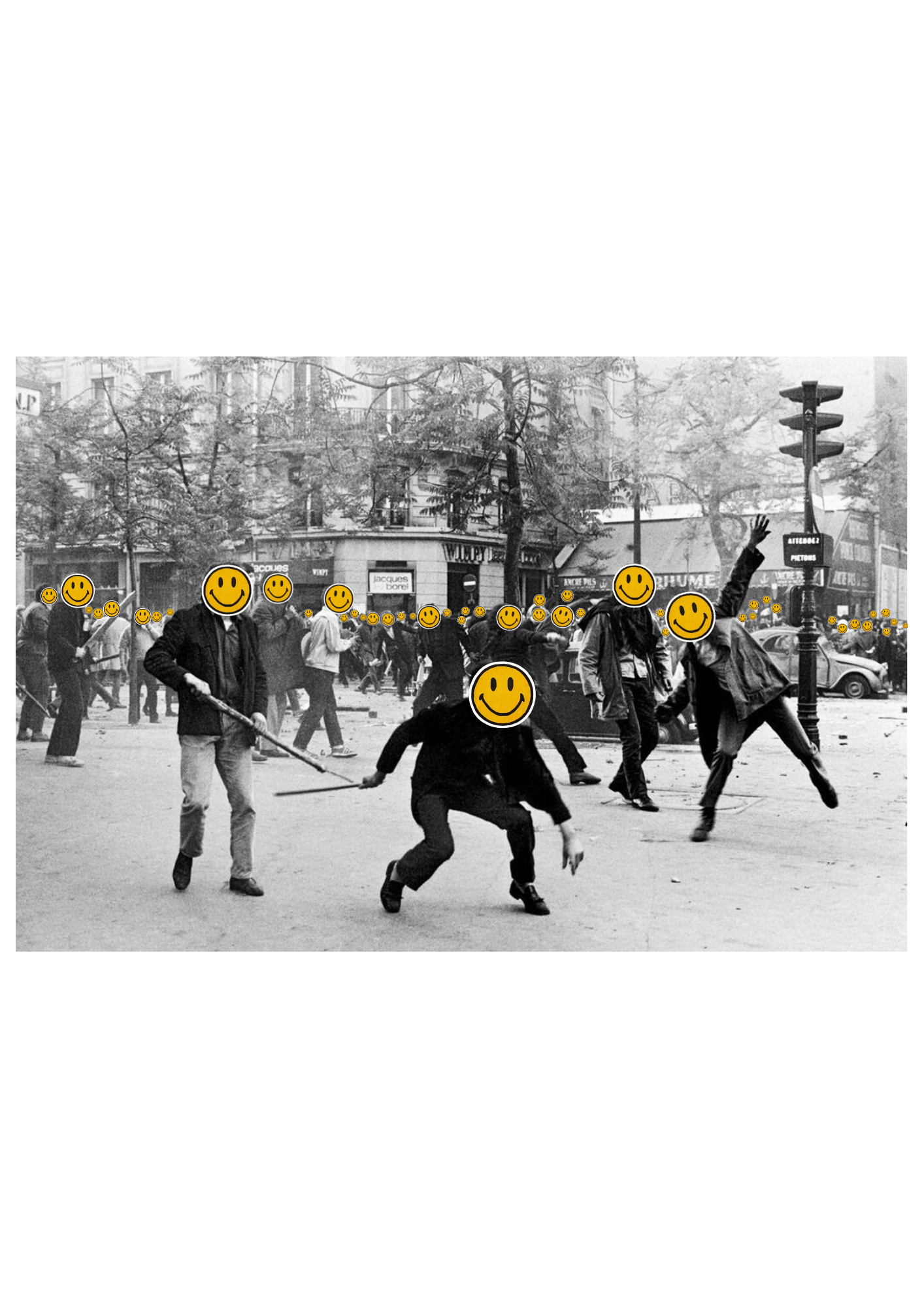 Ce collage revient sur les événements de Mai 68 en remplaçant les visages des manifestants par des smileys. Ce masque nous interroge sur notre rapport aux images du passé, la manière dont nous filtrons la violence ou l'injustice, et ce que la mémoire collective choisit de retenir.