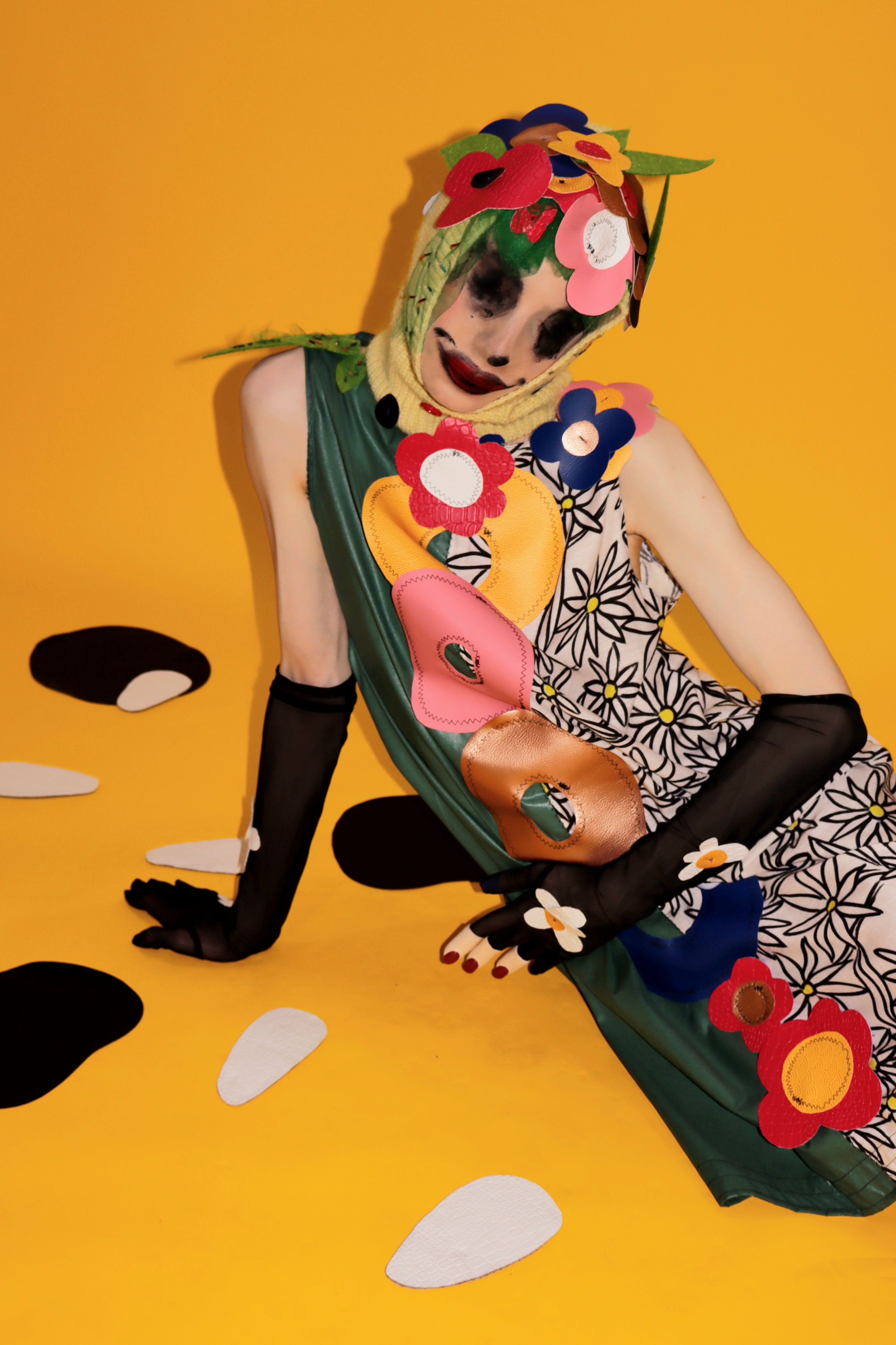 Ce costume a été fabriqué durant le mois de décembre 2025. Des coupons de 3 mètres de tissu ont été acquis à bas prix au marché Saint Pierre. Par la suite, j'ai récupéré des modèles de vêtements des années 60, communément appelés robes trapèzes. Très renommées durant cette période. Puis, j'ai confectionné une cagoule crochetée ornée de fleurs en Skaï par-dessus. Les gants noirs apportent une touche d'élégance et de sophistication à la tenue. Au bout de ces gants, vous trouverez des doigts en céramique conçus par Sohaw, avec qui j'ai collaboré. On trouve aussi des pétales de papier avec du skaï disposé au sol.Le désert sera symbolisé par le Skaï noir associé à un fond jaune, sans aucune issue de de secours. Le masque je l'ai peint avec du rouge à lèvres et de l'aquarelle. Mon inspiration provient de Twiggy Flower Power 1967 par Richard Avedon, le jeu vidéo Cuphead FlowerBoss et des créations de Joyce Pensato.