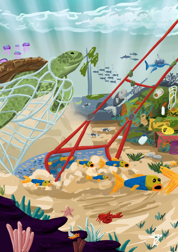 À travers cette illustration, j’ai voulu dénoncer les graves impacts de la pollution sur la mer, à court comme à long terme. Les mers et les océans possèdent la plus grande biodiversité de la planète et recouvrent 71 % de la Terre. Ils jouent un rôle essentiel pour la vie terrestre : ils produisent une grande partie de l’oxygène que nous respirons et régulent le climat. Pourtant, les activités humaines les menacent. L’augmentation du CO₂ réchauffe l’eau et provoque le blanchissement des coraux. La pêche intensive détruit les fonds marins, capture des espèces non désirées qui sont rejetées mortes, et piège certains animaux dans des filets. La pollution plastique envahit aussi les océans : sacs, bouteilles et déchets se fragmentent en microplastiques, souvent confondus avec le plancton par les tortues et les poissons. Comment pouvons-nous éviter nos impacts sur les océans dans l'avenir ?