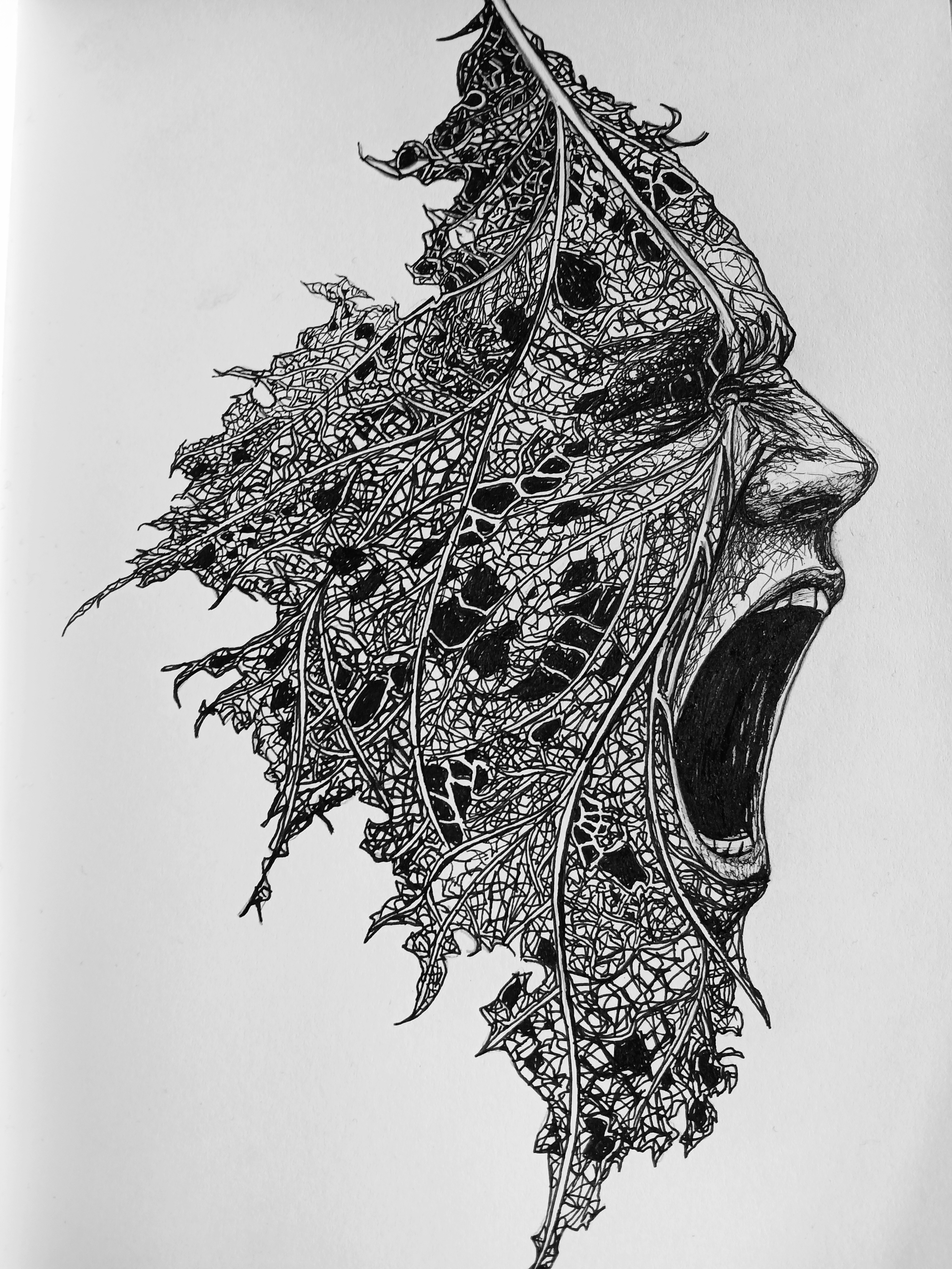 L’idée du dessin est née de l’envie de matérialiser ce cri silencieux : une feuille squelettique devient visage, ses nervures se transforment en racines et en veines pour montrer la connexion profonde entre l’humain et la nature.