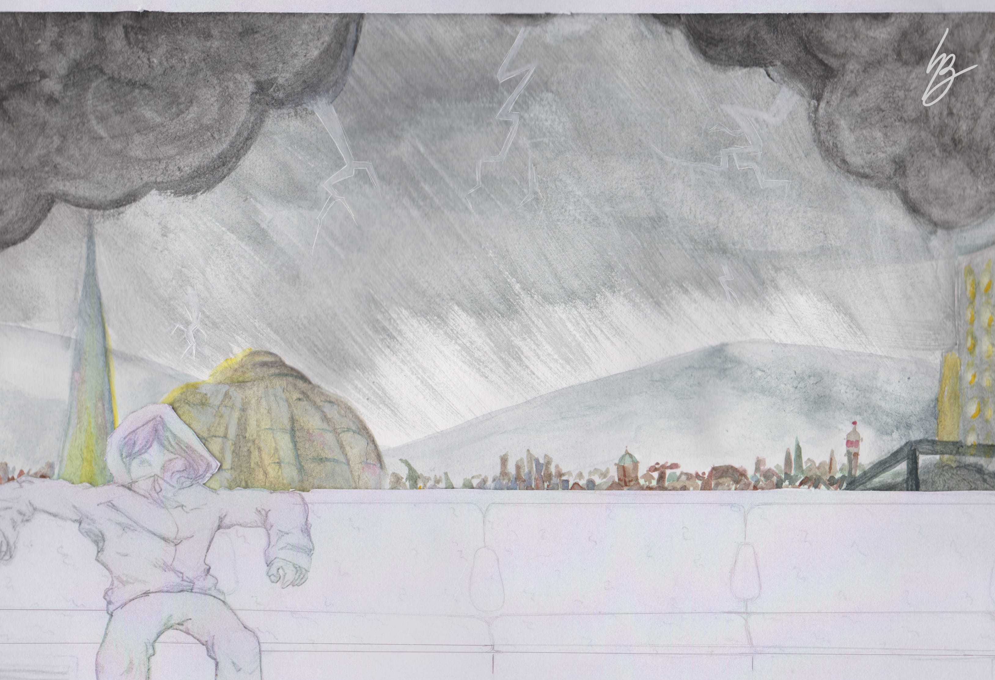 J'ai commencé par faire des esquisses des bâtiments pour avoir une idée d'à quoi pourrait ressembler l'horizon de cette ville.