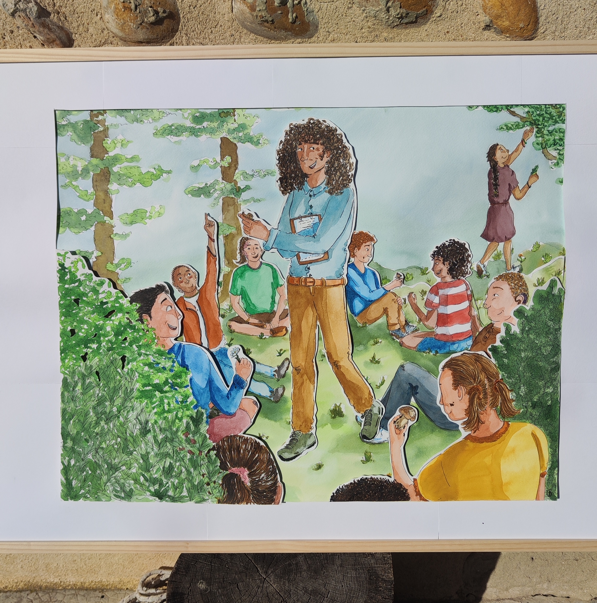 Je les ai ensuite peint, puis je les ai découpés au scalpel, pour enfin les recoller afin de créer une profondeur dans le groupe d'élèves, avec la professeure au centre, comme source de savoir.