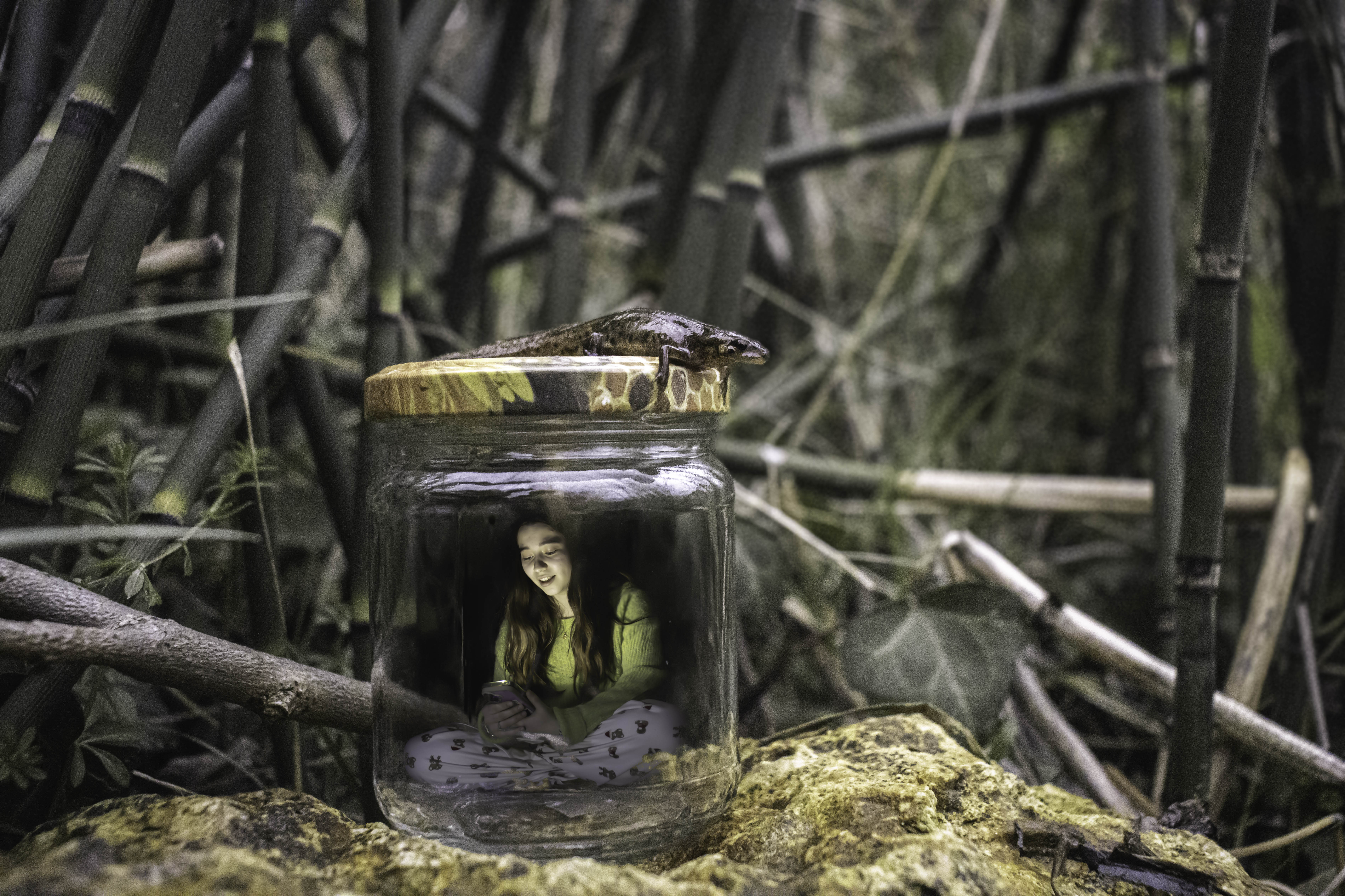 La création de cette image repose sur un procédé de double exposition numérique construit à partir de deux prises de vue originales. La première photographie a été réaliser en milieu naturel, où le bocal a été intégrer dans l'environnement du triton. Une attention particulière a été porter au cadrage, à la lumière naturelle et à la profondeur de champ afin de valoriser la présence du triton comme figure centrale. La seconde prise de vue a été réalisée dans un environnement sombre et neutre, afin d'isoler la silhouette humaine assise dans le bocal et éclairée uniquement par la lumière de l'écran. Les deux images ont ensuite été assemblées en post-production sous Adobe Photoshop à l'aide d'un empilement de calques et du mode de fusion "superposition", permettent une intégration réaliste et cohérente des deux prises de vue. Ce processus à permis de construite une image symbolique tout en conservant une base photographique authentique. (Canon EOS 90D)