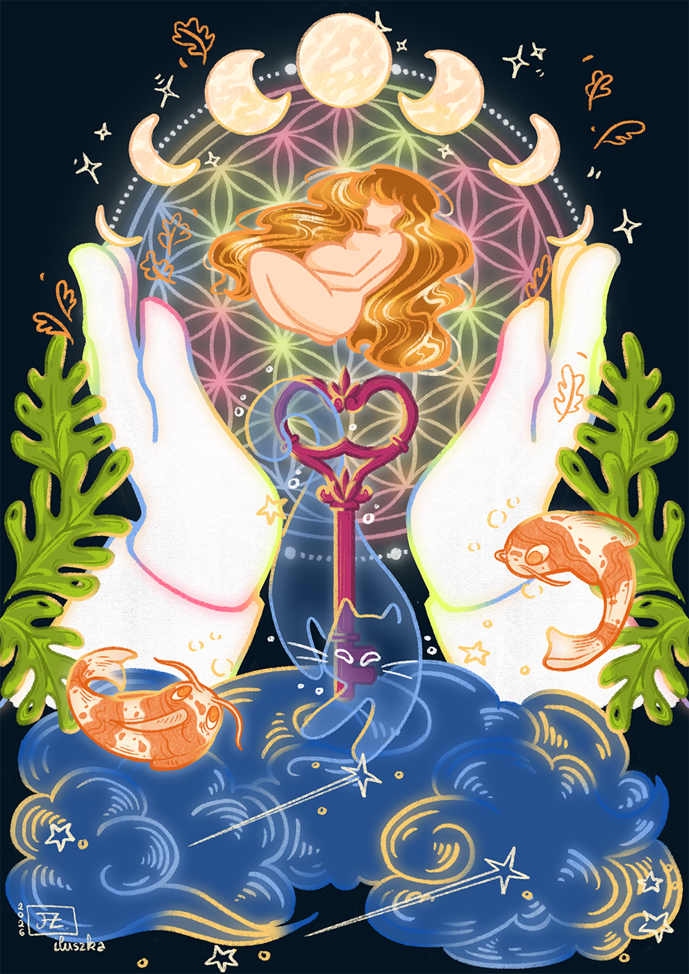 Cette illustration est une première pour moi dans une DA nocturne et onirique où chaque éléments désignent une appartenance et une signification autour du vivant, de l'invisible et de la naissance.