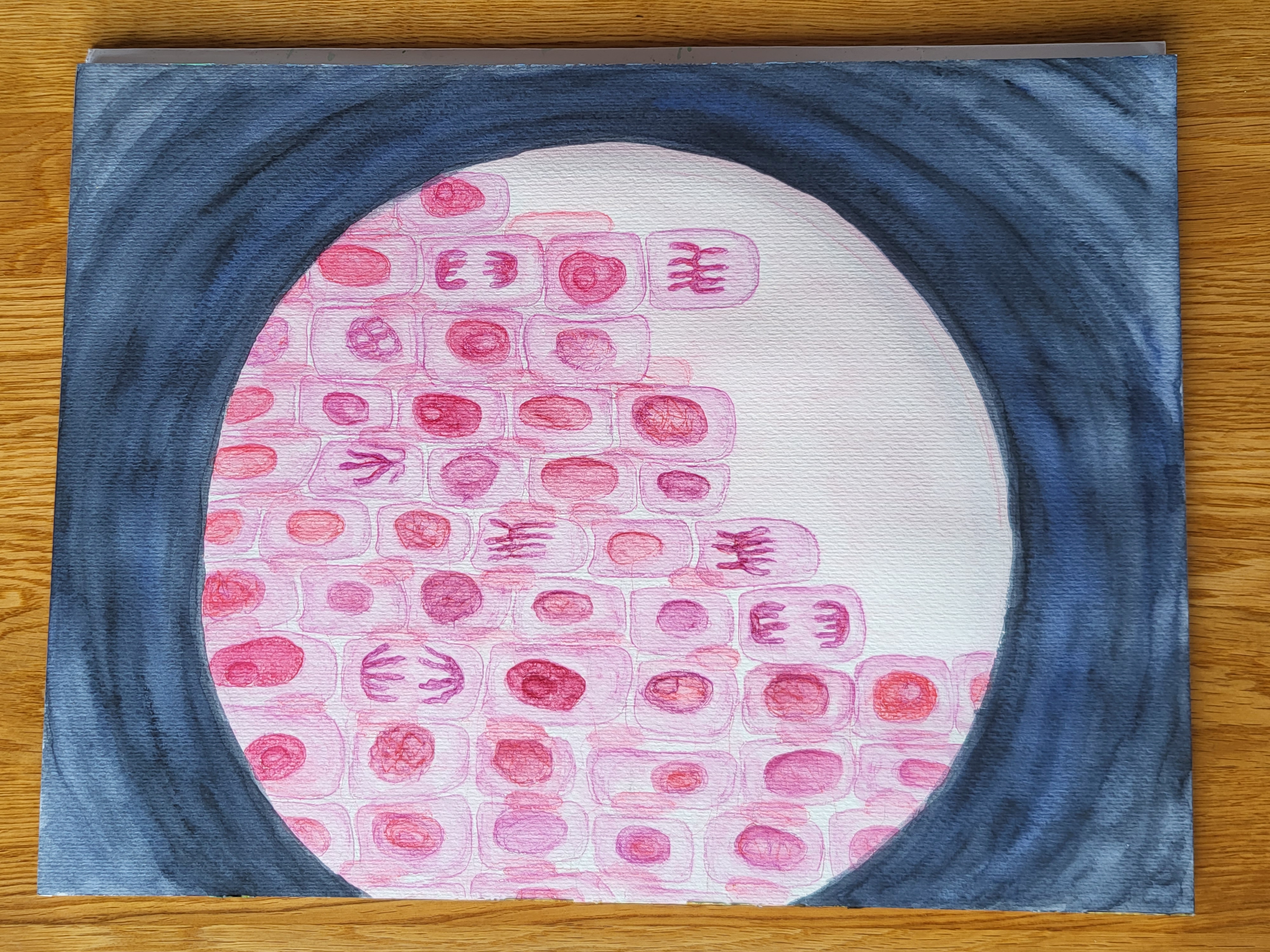 J'ai utilisé de l'aquarelle et des crayon aquarellables pour essayer de reproduire ce que je voyais dans ce microscope. J'ai aussi voulu representer dans ce zoom quelque chose de beau avec des couleurs qui ressortent avec le tour foncé arrondi face à l'intérieur aligné et arrangé des cellules.