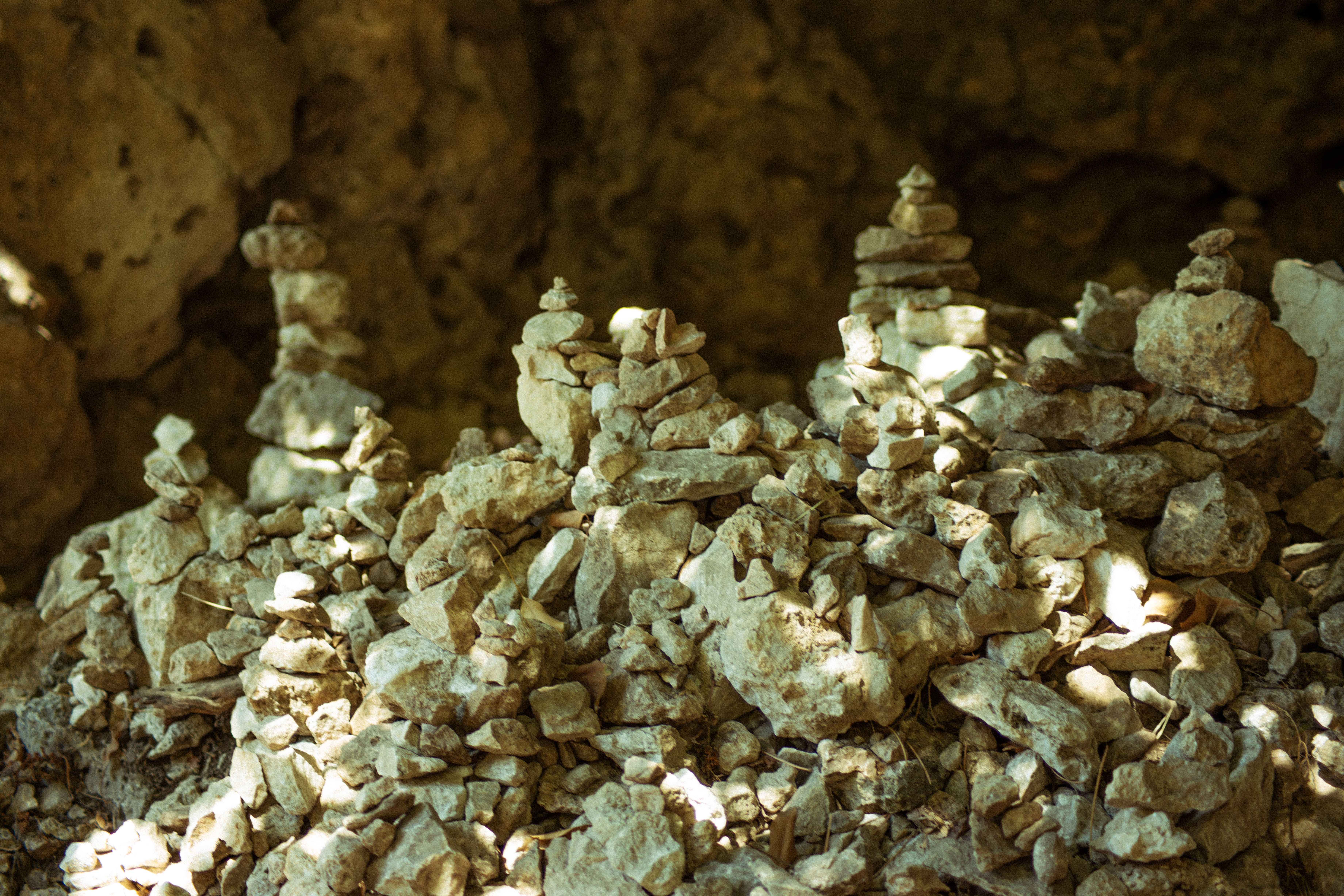 Des pierres empilées les unes au-dessus des autres, réalisées par des humains, pour des humains. Depuis la nuit des temps, les explorateurs construisent ces cairns, tas de pierres ayant parfois la forme d'un bonhomme, pour marquer leur passage et aider les prochains à se repérer. Plus le temps est passé, moins ces édifications se sont rendues utiles par l'arrivée des nouvelles technologies. Pourtant, ils n'ont pas disparu. Encore aujourd'hui, partout dans le monde, on peut retrouver ces cairns, souvent sur des chemins de randonnée, chaque passant rajoutant sa pierre à l'édifice. Je trouve que ces pyramides sont la parfaite représentation d'une société qui a évolué dans le temps, qui s'aide et s'entraide, dont chaque individu est lié à l'autre par cette pierre, peu importe les âges et les frontières. Plus qu'un simple moyen de se repérer, le cairn est une œuvre collaborative, unique et éphémère, fondée par des individus éphémères grâce à un matériau fruit d'une nature éternelle.
