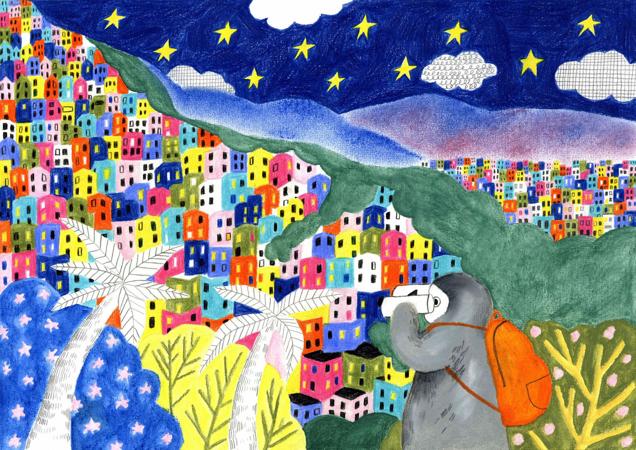 Mon illustration s'inspire de paysages vus lors d'un voyage au Brésil. J'ai été marquée par les habitations précaires de certains habitants, qui souffrent des catastrophes naturelles liées au changement climatique. À travers cette illustration, j'ai voulu représenter une ville idéalisée et apaisante, où des habitats colorés cohabitent avec une nature verdoyante. Je souhaite montrer qu'il est aujourd'hui nécessaire de repenser les villes de demain tout en laissant la nature s'épanouir.