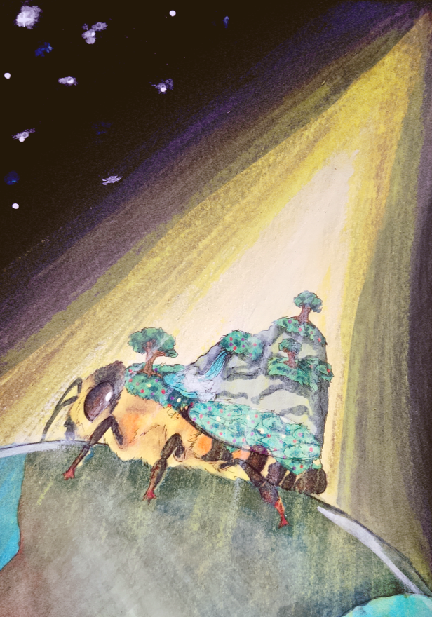 Pour cette oeuvre j'ai d'abord cherché un animal dont le rôle sur terre est essentiel afin de lui faire porter la vie/la nature. Pour le mettre en avant j'ai décidé de changer les proportions de l'abeille afin qu'elle soit aussi grande qu'un continent pour rappeler l'importance de son rôle. J'ai fait arrivé un rayon de lumière sur elle comme signe d'espoir et rappeler un côté un peu divin puisque l'avenir de la planète dépend en partie de sa vie sur terre.