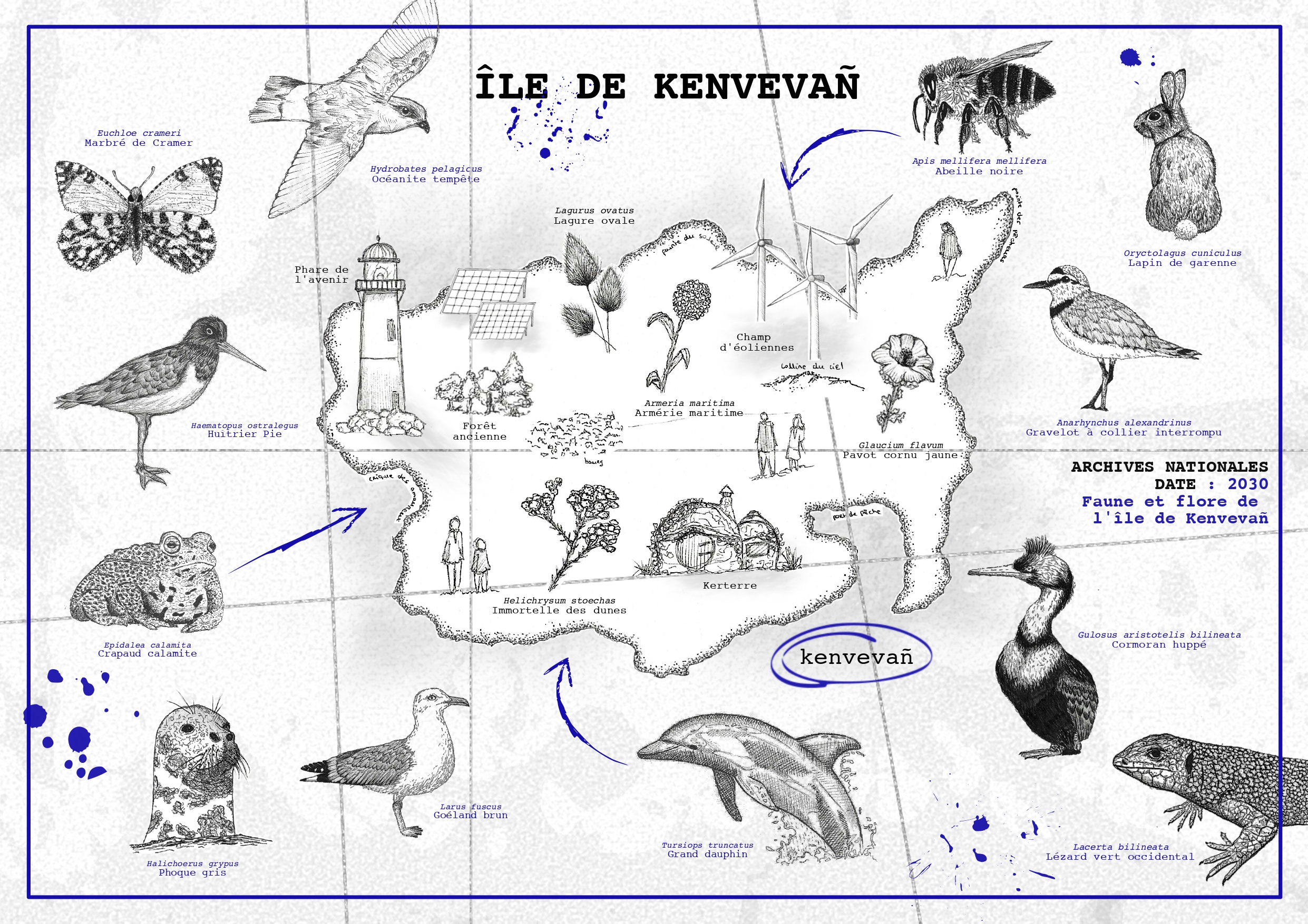 À travers cette carte d’une île imaginaire, j’ai souhaité imaginer ce que pourraient être les archives futures de nos territoires vivants.
