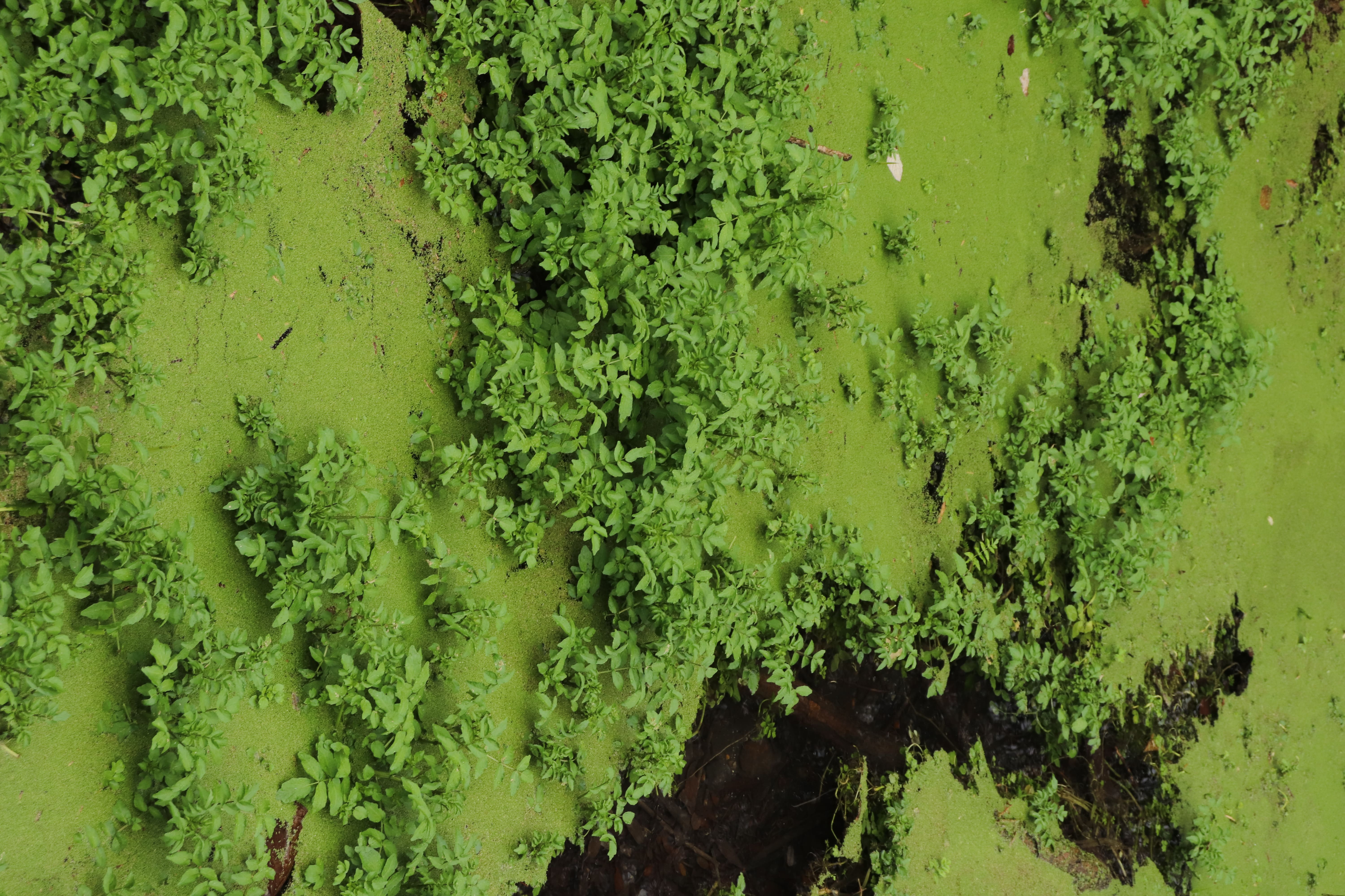 Surface de rivière devenue carte vivante : plantes et eau dessinent un territoire autonome, en mouvement sous le vert éclatant.