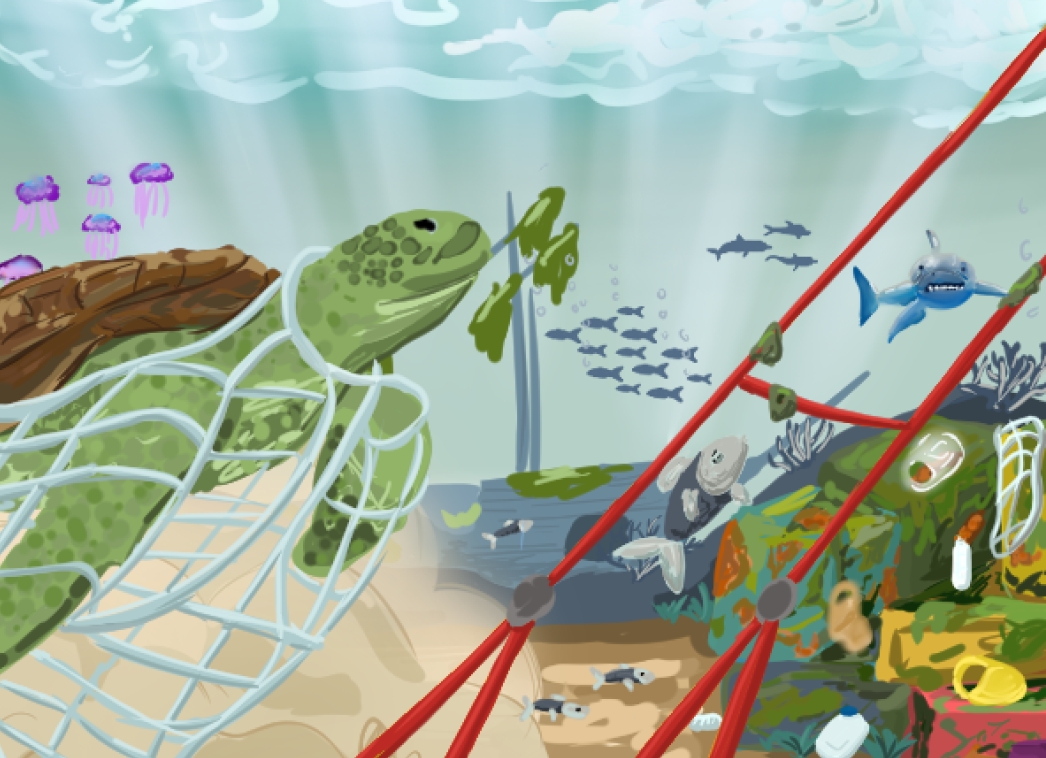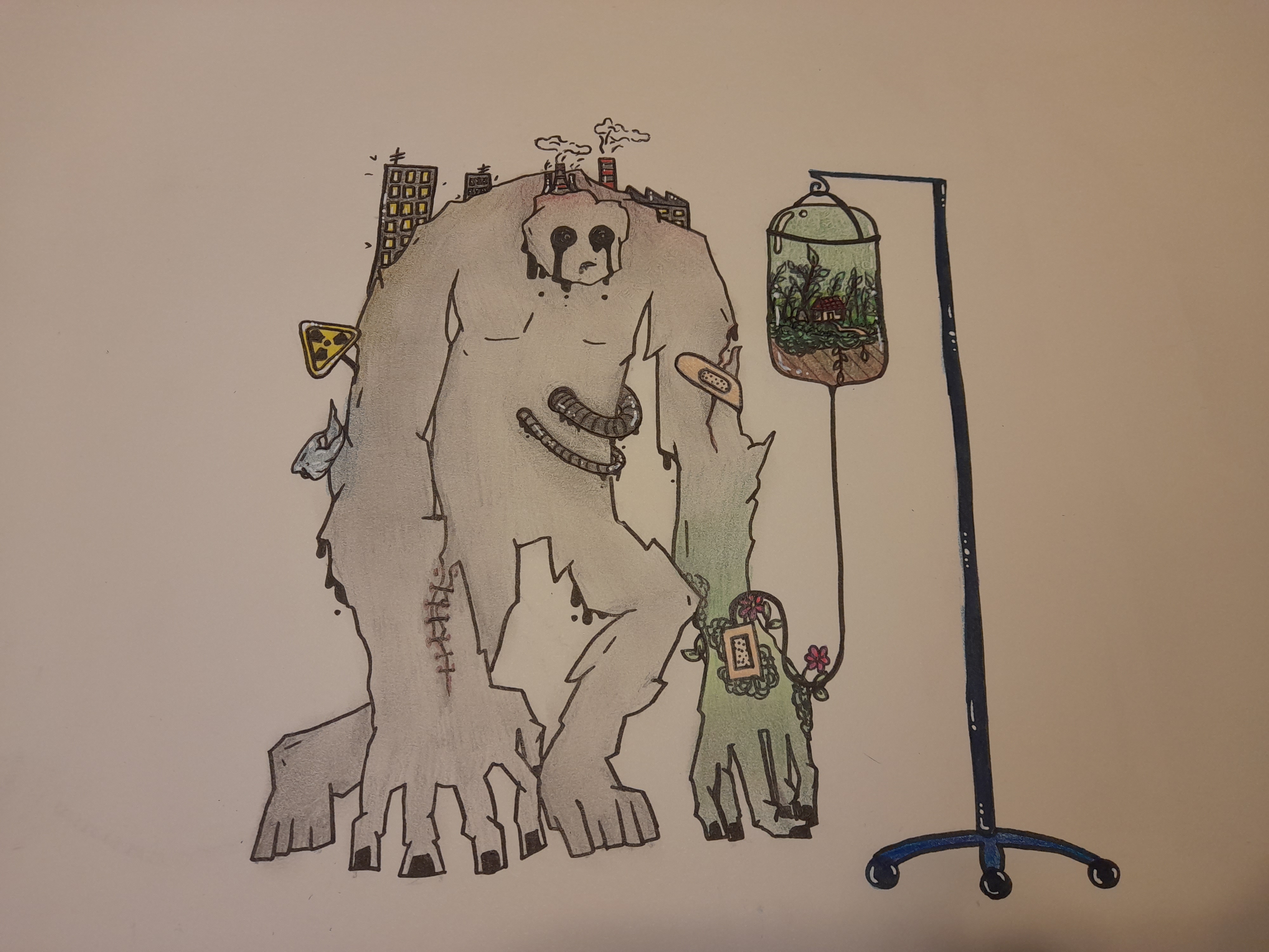 J'ai personnifiée le territoire avec la Terre sous forme humaine, l'industrie est présente. La Terre se guérie avec de la nature.